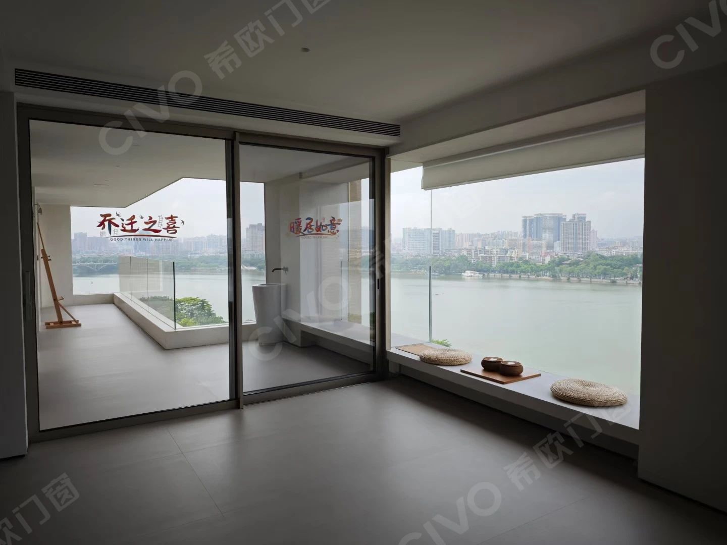 推拉窗廠家希歐門窗項目:一線江景大宅封窗,半封陽臺+全景落地窗